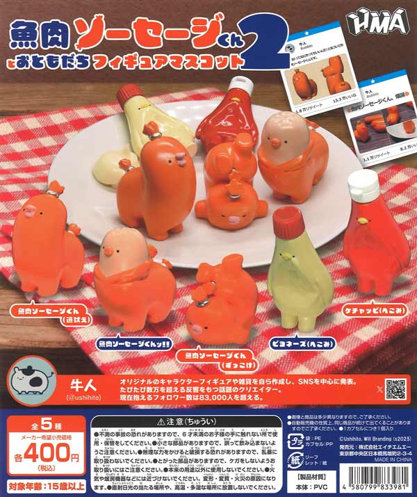 人気クリエイター「牛人(ushihito)」さんがTwitterで発表し話題になった、シュールでかわいい魚肉ソーセージのオリジナルキャラクター、魚肉ソーセージくんのマスコットのガチャガチャ第2弾「魚肉ソーセージくんとおともだち フィギュアマスコット2」が登場。
