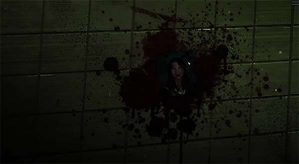 エントランスにある生徒たちの写真のひとつが血にまみれ、左側に何かの模様が描かれている。