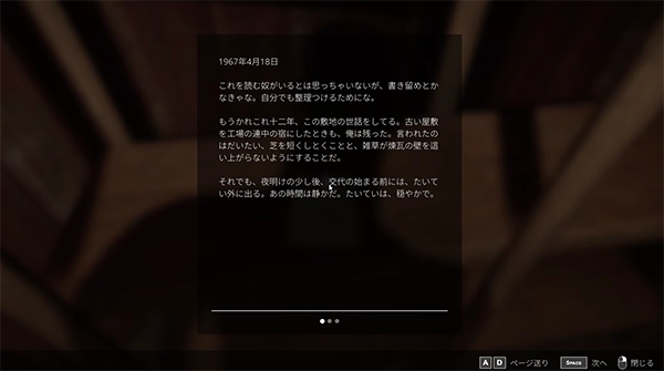 家の中に色々な仕掛けが施されて、それを解いて日記を見つけたり、鍵を見つけたり、新たな部屋に進むためのキーアイテムを見つけたりする。