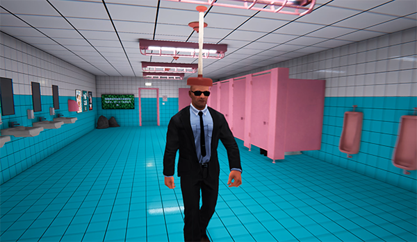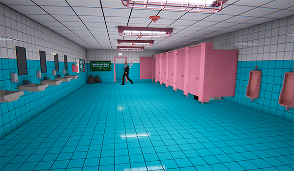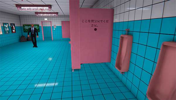 トイレの中には小便器、個室トイレ、洗面台や鏡、そして壁に貼り付けられたポスターなどが散りばめられているが、オブジェクトの数そのものはそこまで多くない。