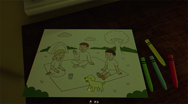 お絵描きでは、まず家の中に散らばっている4色のクレヨンを集めてきて、本に書かれている通りの配色で色を塗っていく。