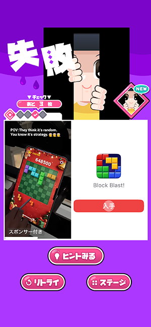 この手のジャンルのゲームは、ステージをクリア・失敗したりすると長い広告が流れて、ゲームの進行のテンポを妨げるものが多いですが、「カニゲーム -脱出ゲーム」は「ヒントを見る」ときに動画広告が流れるだけです。