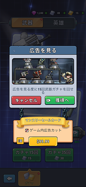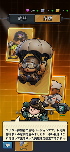 武器は毎日無料で3回(45連)、英雄も3回(45連)、広告を見ることで回すこともできます。